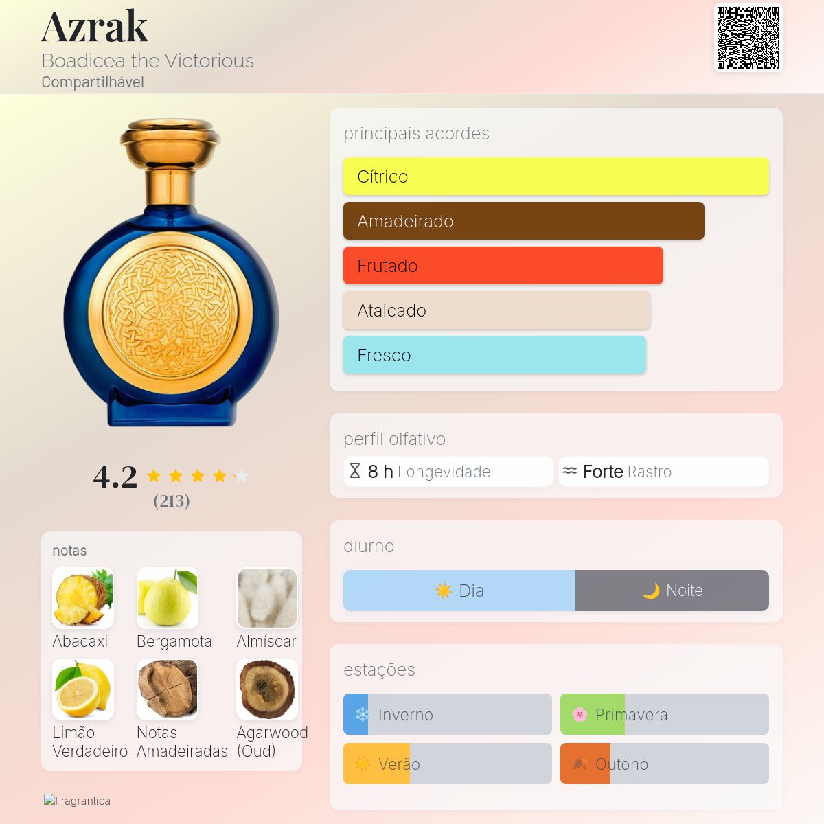 Com performance sólida, projeção marcante e personalidade própria, Azrak se destaca como uma opção versátil para quem quer um perfume refinado, aquático-amadeirado e memorável. Perfeito para ocasiões especiais, encontros emocionantes ou simplesmente para marcar presença com estilo.
