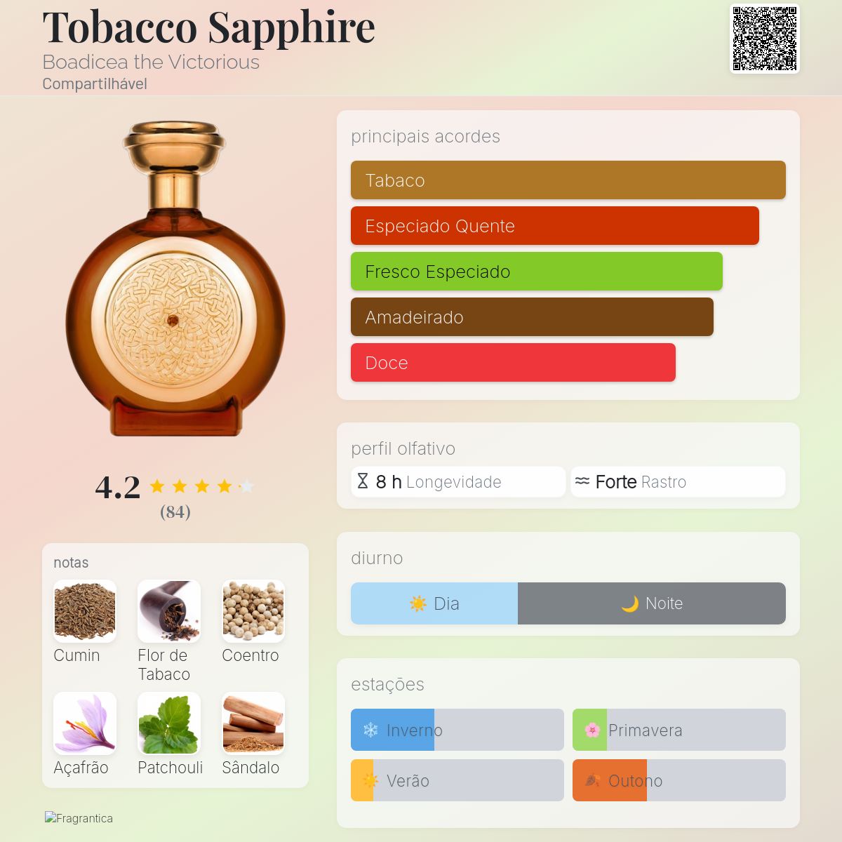 Boadicea the Victorious Tobacco Sapphire é uma fragrância que envolve desde o primeiro instante. Rica, quente e profundamente sedutora, sua construção gira em torno do tabaco em sua forma mais elegante, denso, levemente adocicado e absolutamente viciante.
