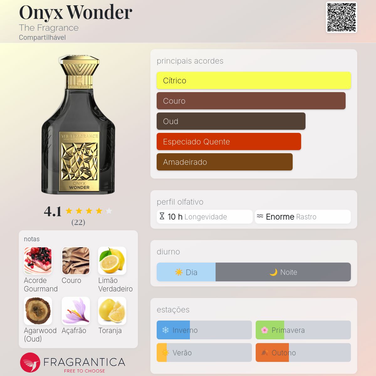 Onyx Wonder começa com um frescor cítrico que rapidamente se transforma em um coração rico e robusto, dominado por couro e especiarias nobres. A base amadeirada mantém a fragrância enigmática e sofisticada, com uma projeção e fixação notáveis que a tornam ideal para climas frios ou uso noturno.